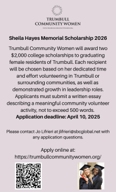 Trumbull Community Women will award two $2,000 college scholarships to graduating females who are residents of Trumbull. Each recipient will be chosen based on her dedicated time and effort volunteering in Trumbull or surrounding communities as well as demonstrated growth in leadership roles, and the subject content of an essay not to exceed 500 words. Please contact Jo Lifrieri at
