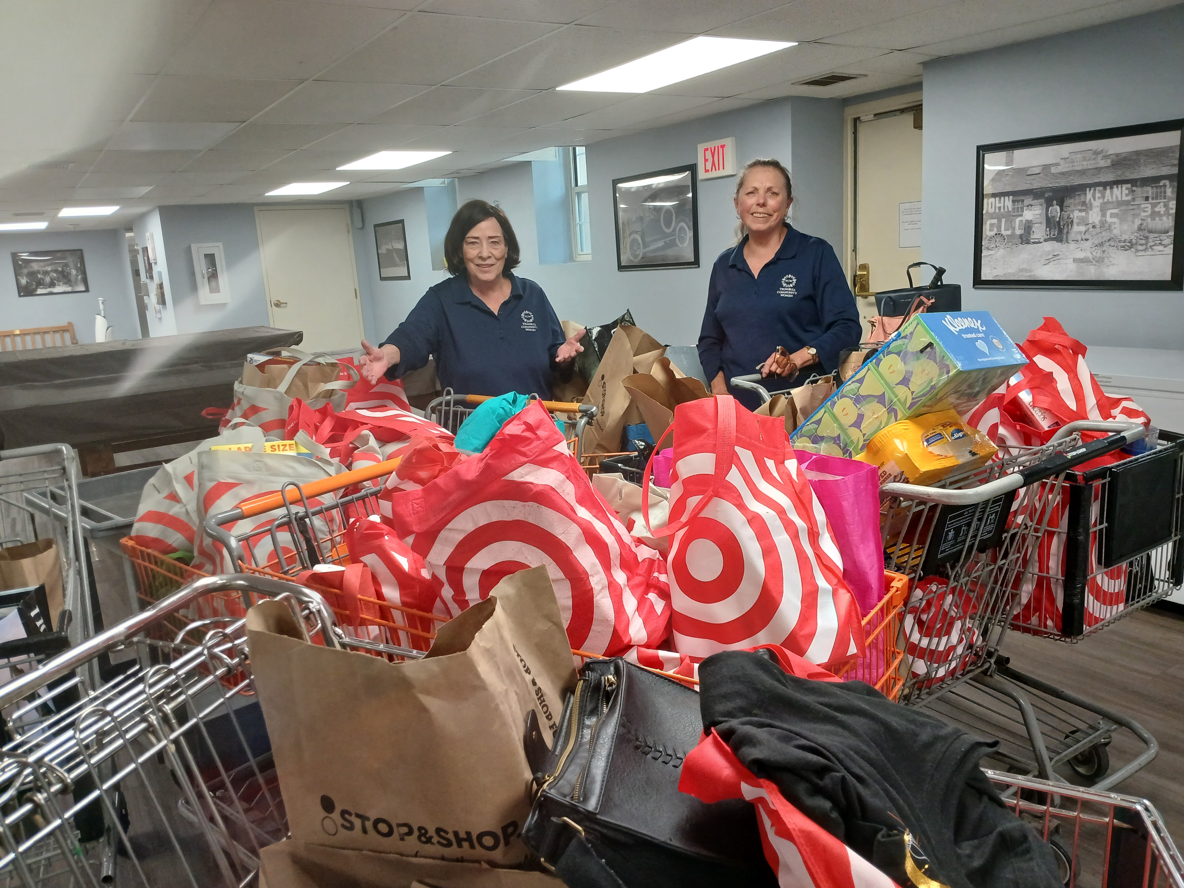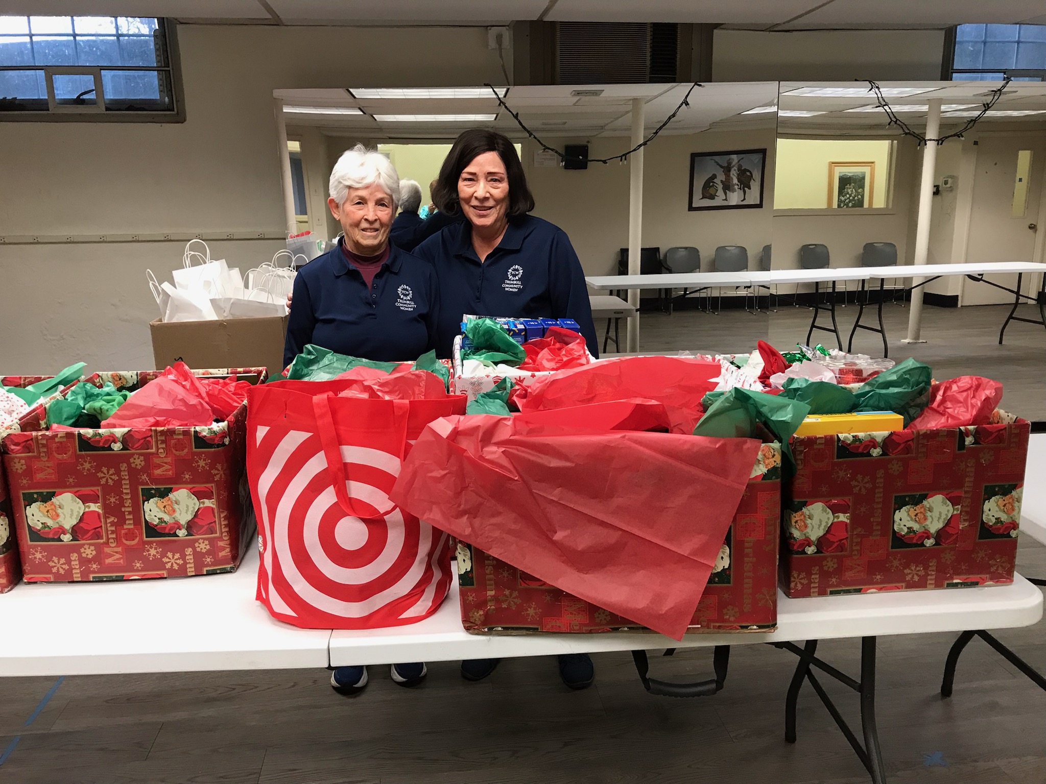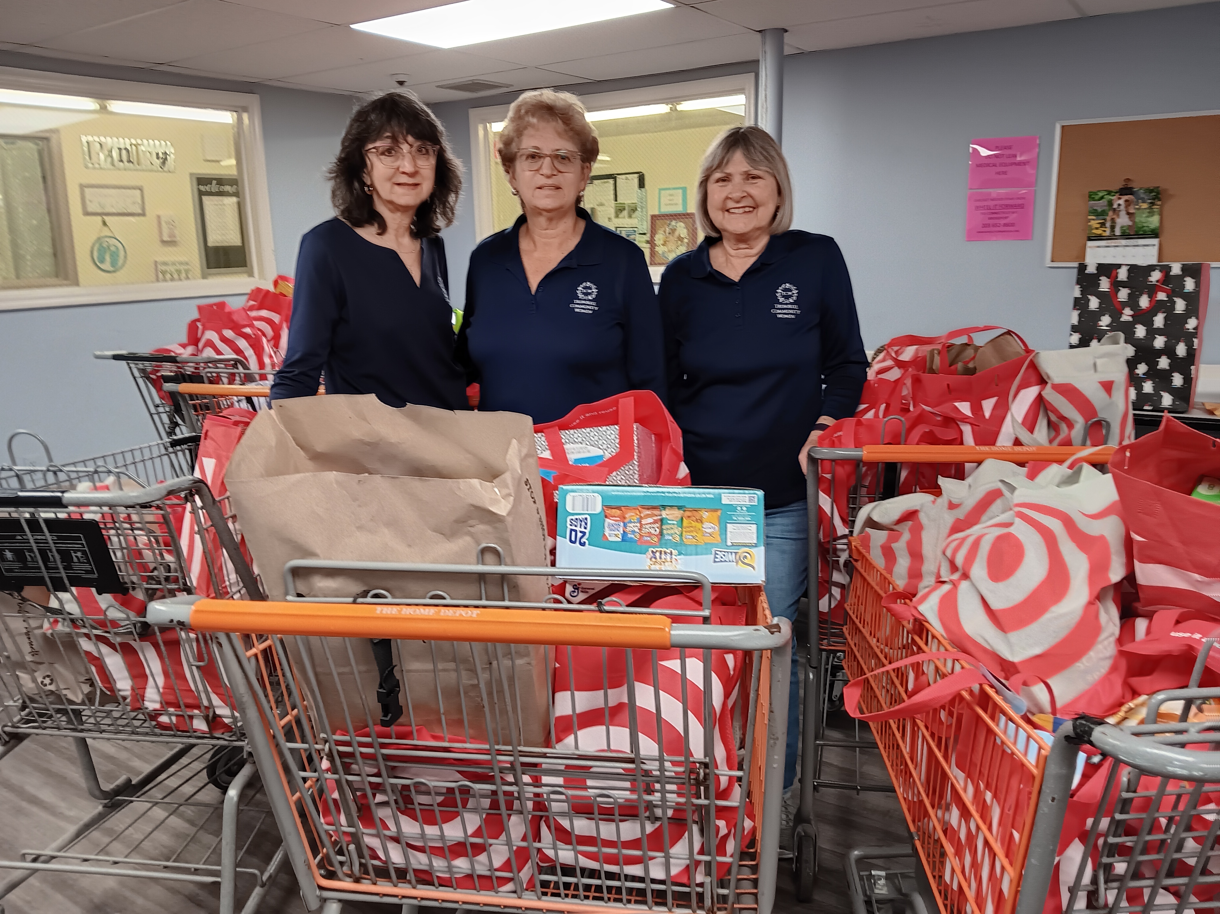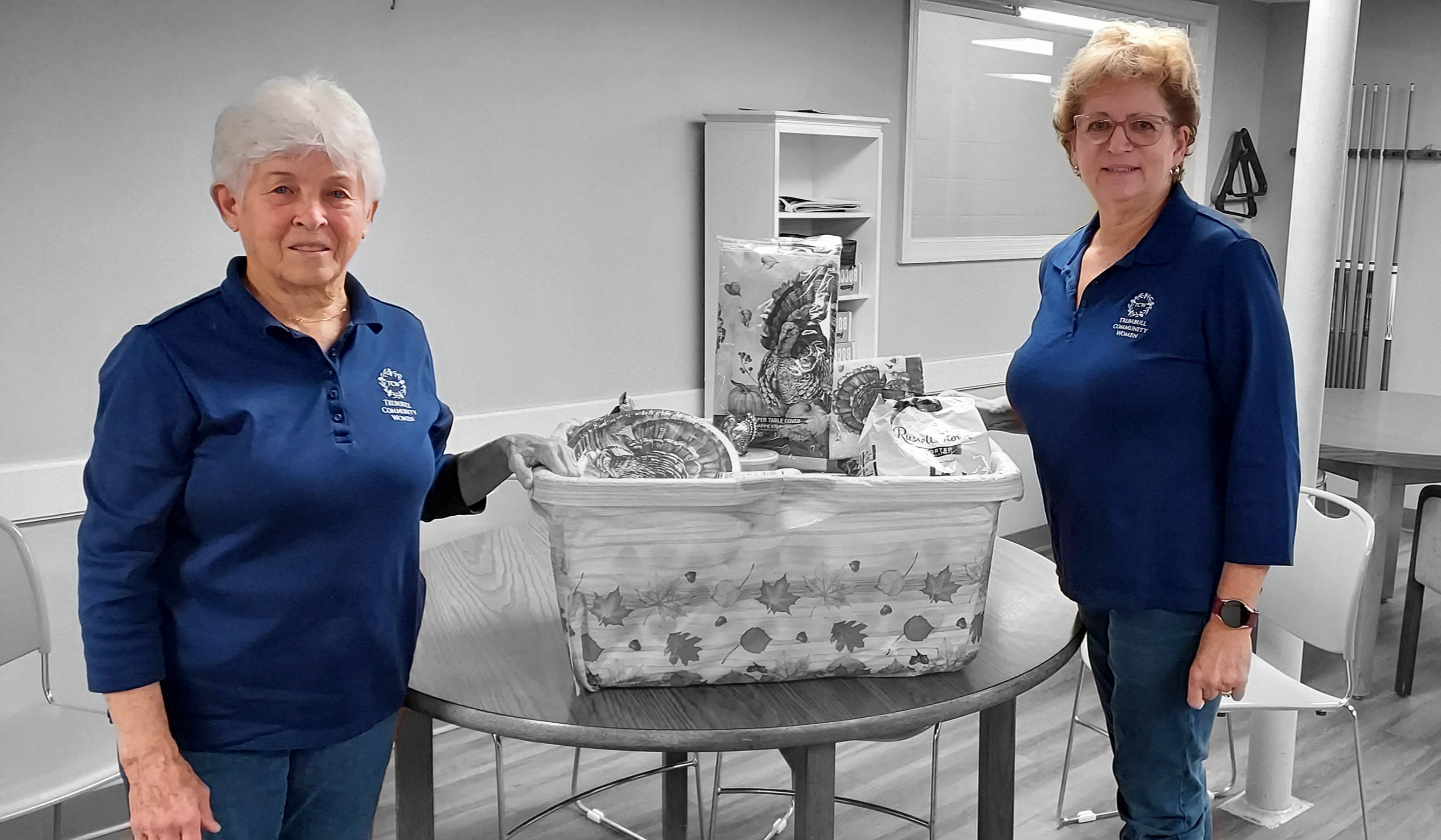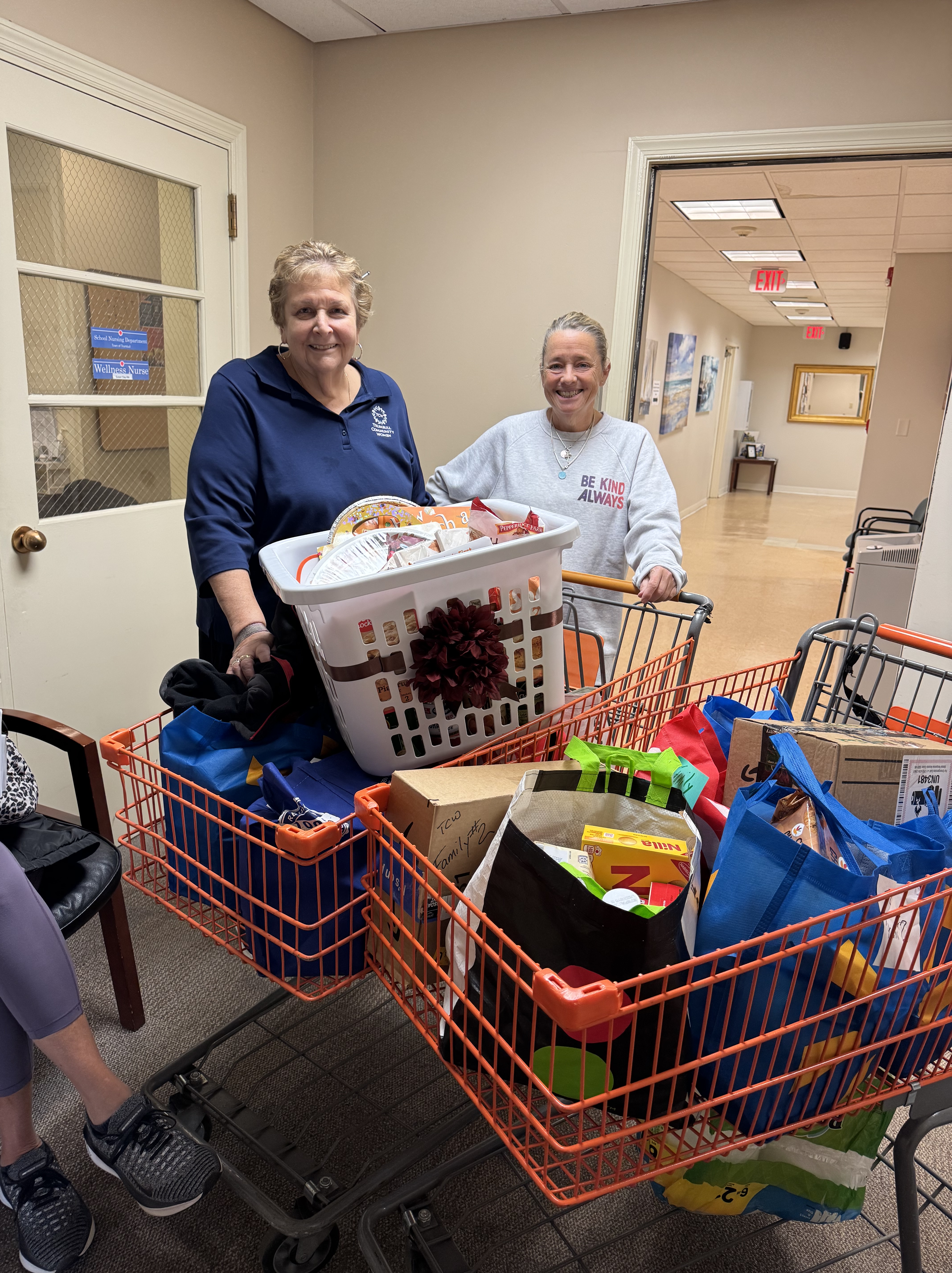 Trumbull Community Women received the names of two families from Social Services and prepared baskets filled with everything they need for Thanksgiving, along with gift cards to help them buy holiday gifts. This photo shows the “basket” for just one of the families!