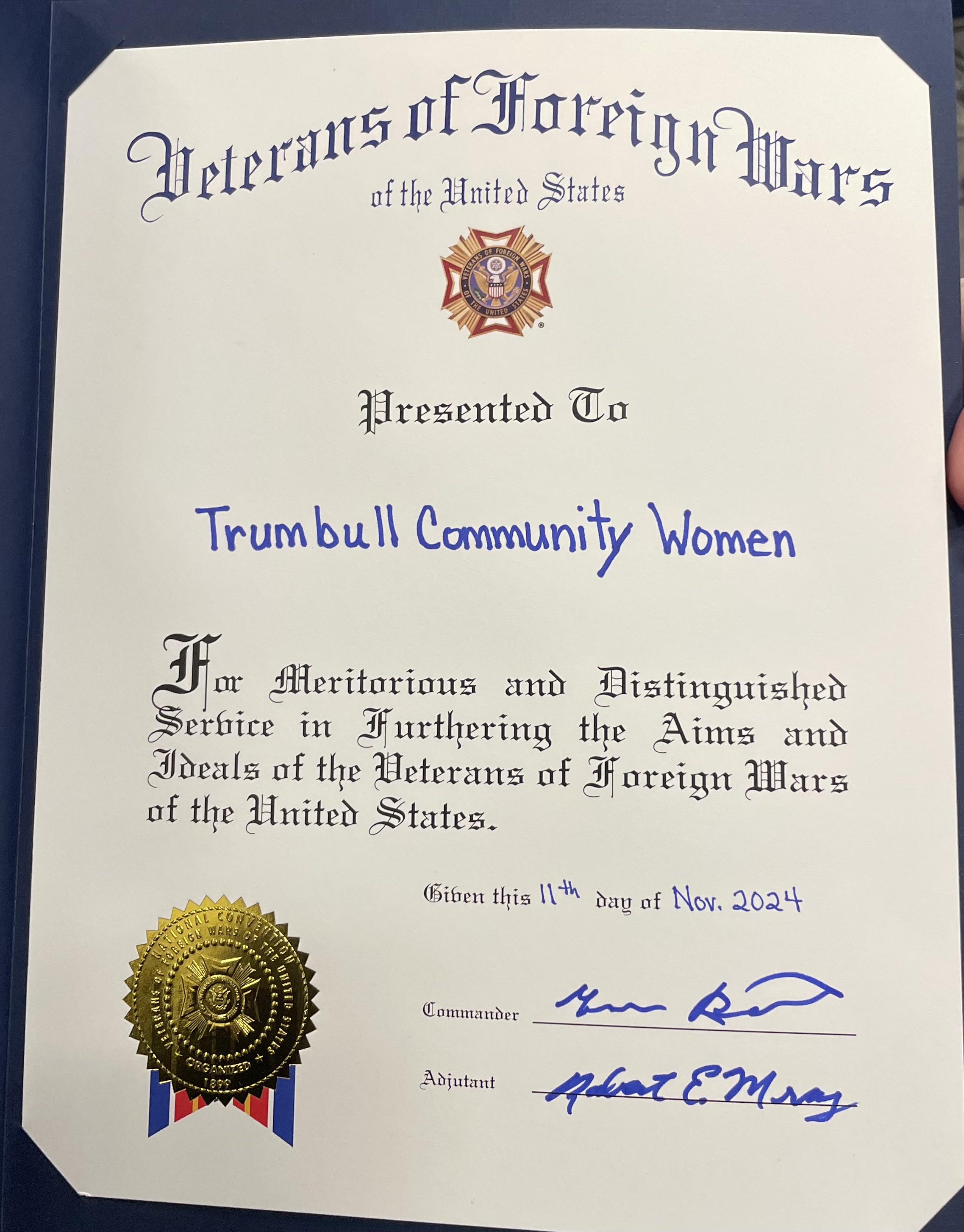 On January 7th, TCW held its first meeting of 2025 which was well attended by current, new and potential members alike. We started off with a special recognition from the VFW for our efforts supporting Veterans. Graham Bissett Commander, Bob Mraz Vice Commander, and Dan Sacco Director of Programs, all of VFW Post 10059, were there for the presentation. After the presentation and a discussion of completed club events and a few upcoming events, Duly opened the meeting for all members to discuss ideas they had for our group to become involved with. Many members have great passion for their projects and we look forward to their write-ups in our newsletter each month telling us more about the organizations they support and how we can get involved. A great start to the new year.