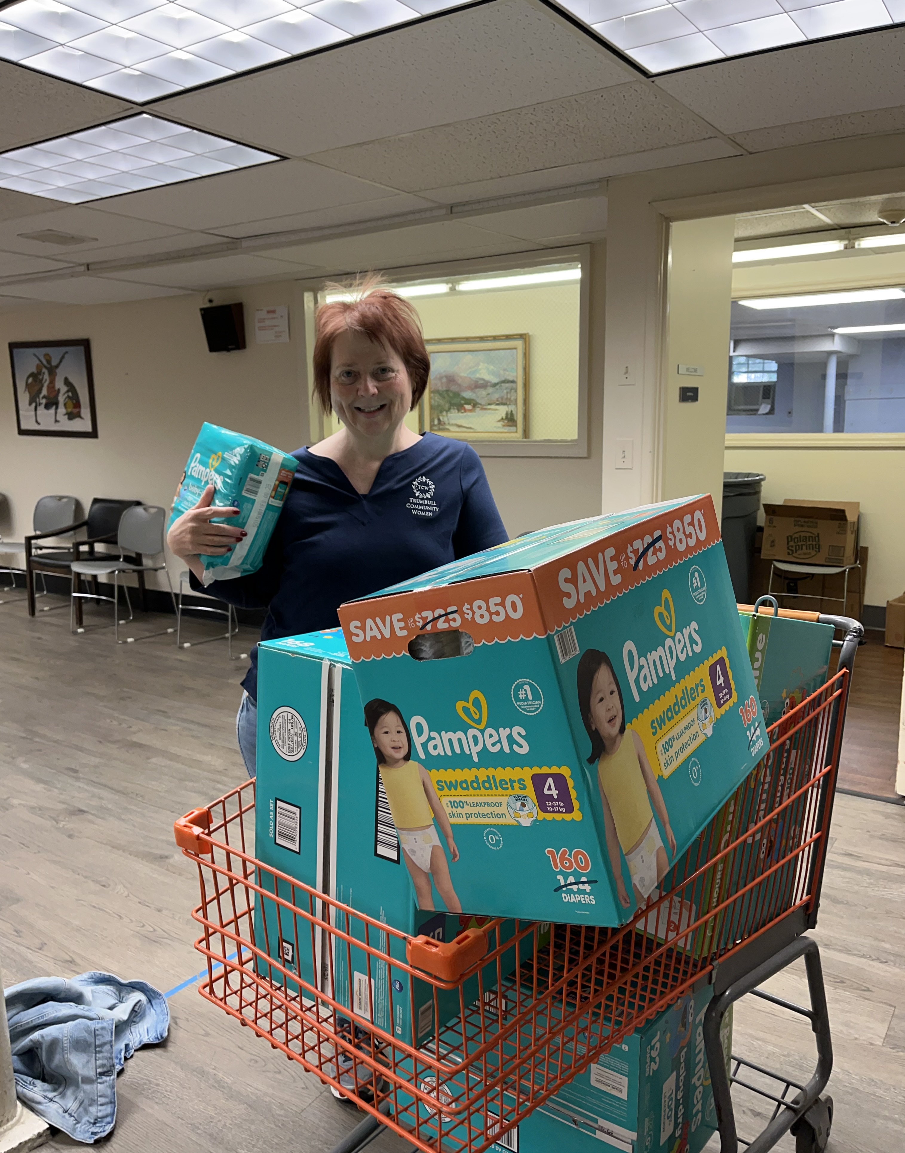 On April 21st, Linda from the Families in Need Committee delivered diapers totaling almost $250 to the Trumbull Food Pantry for the families in need of diapers for their little ones. They were most appreciative of our donation.
