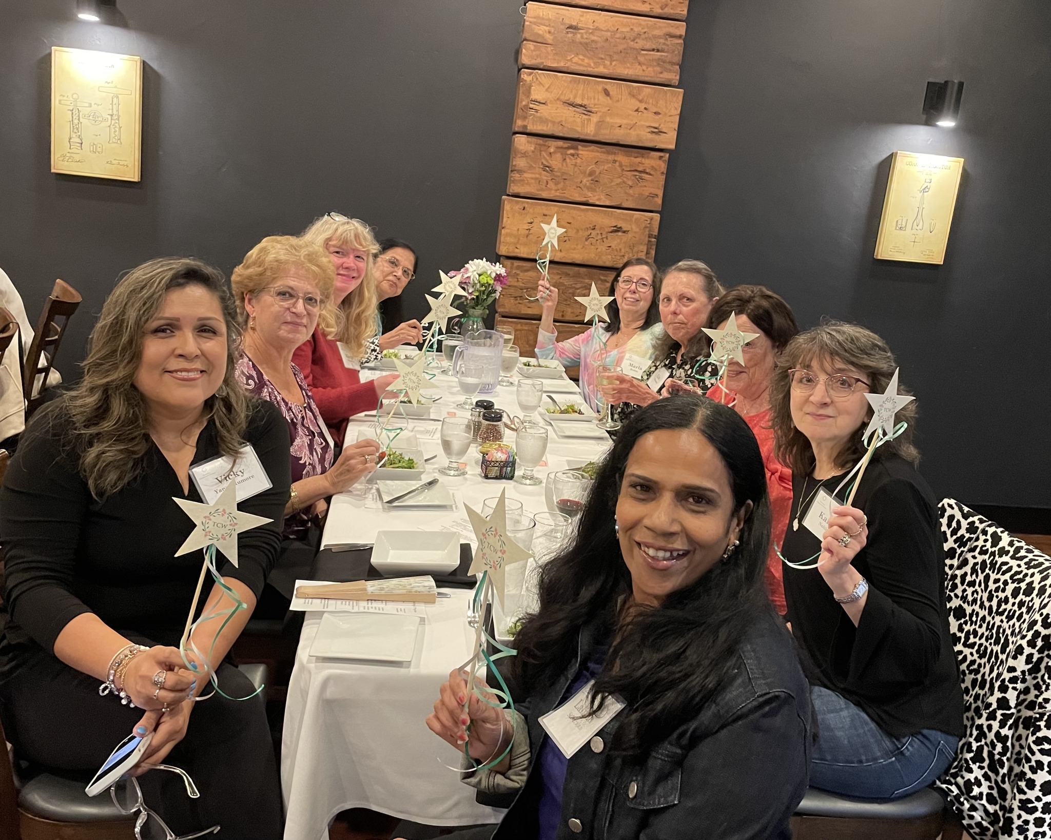On May 6th, TCW held our annual Installation Banquet at Jennie’s Pizzeria. Members enjoyed the opportunity to socialize, enjoy dinner, celebrate the year’s achievements, and install our new Executive Board. Our Social Committee: Vicky, Debi, and Michelle did an amazing job planning and organizing this event. Sue S. began the evening with an invocation followed by Nannette leading us in a toast. Once dinner concluded, our outgoing President Duly gave a lovely speech recounting the events of the year, and thanked all the members for the privilege of being their President. She then gave appreciation gifts to the outgoing Board members. Special awards were also given to Terri for her 10 years as Parliamentarian, Bernadette for generously crafting beautiful gift baskets for club events, and Vicky for providing us with 4 years of fun, camaraderie, and laughter . Next, Andrea recognized Kiran and Tina for their 5-year anniversaries and Sandra for her 10-years in the club. Sandra was also recognized as Member of the Year. Next Sandra delivered a heartfelt speech thanking Duly for her extraordinary leadership, and presented a printed photo book featuring pictures from every event over the past 3 years, a gift card to Ecco, and a thank you card signed by members. Sandra symbolically passed the “immediate past President” baton to Duly in the form of a customized baton. Next, Debi installed the incoming Executive Board, absent were Susan D. and Anna who were each traveling at the time. Finally Shirley and Andrea spoke about their hopes and aspirations for the upcoming year. All in all this was a really fun evening, filled with laughter and joy.