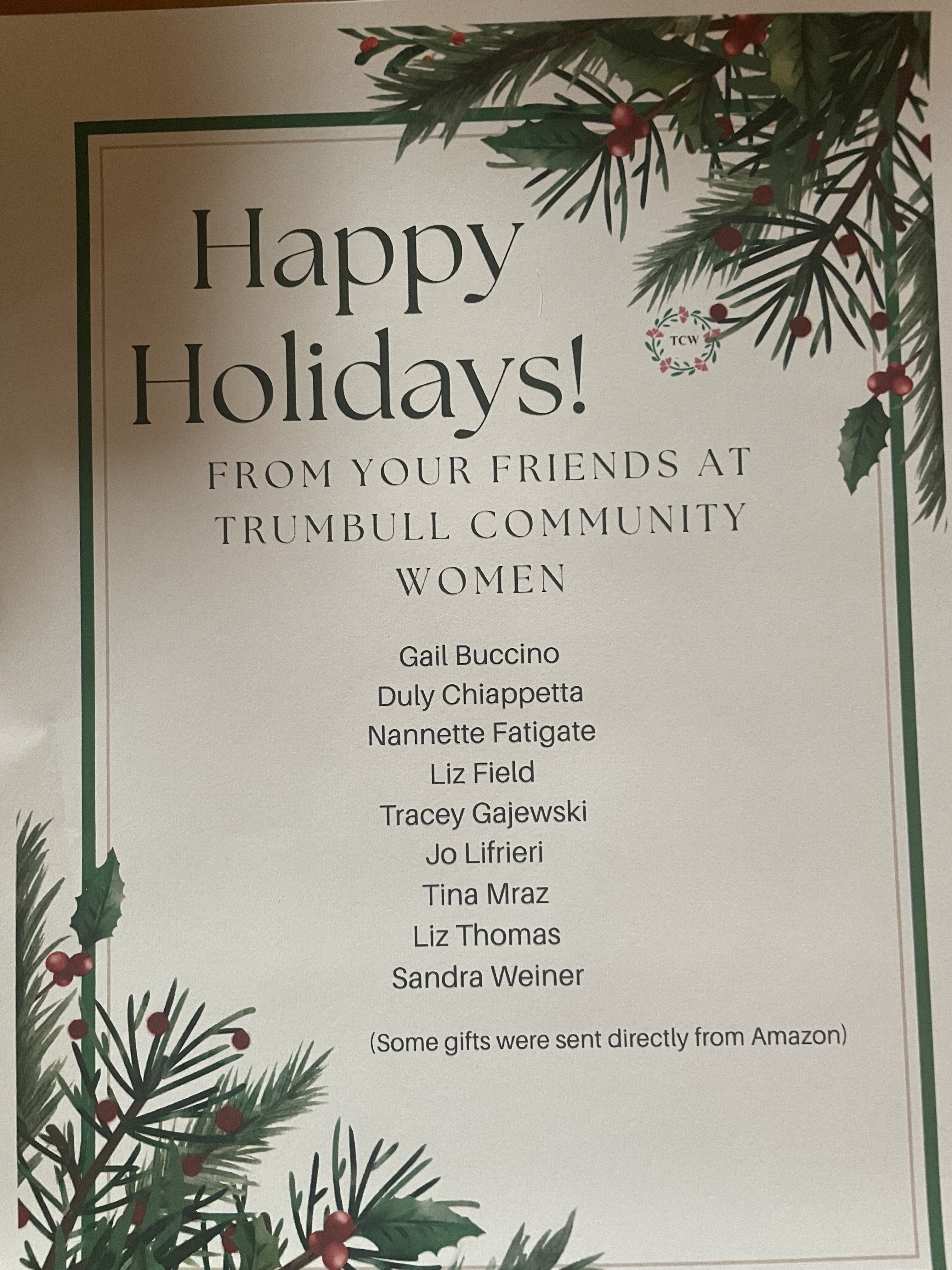 On a crisp Sunday afternoon, TCW members gathered in warmth and camaraderie for our annual holiday celebration. This year’s event took place at the charming Historical Society, which was adorned with festive decorations, creating a cozy atmosphere. Members enjoyed a delightful spread of appetizers and desserts, while some husbands also joined in the festive cheer. A heartfelt thank you to everyone who participated. Wishing all our members and their families a joyful holiday season!