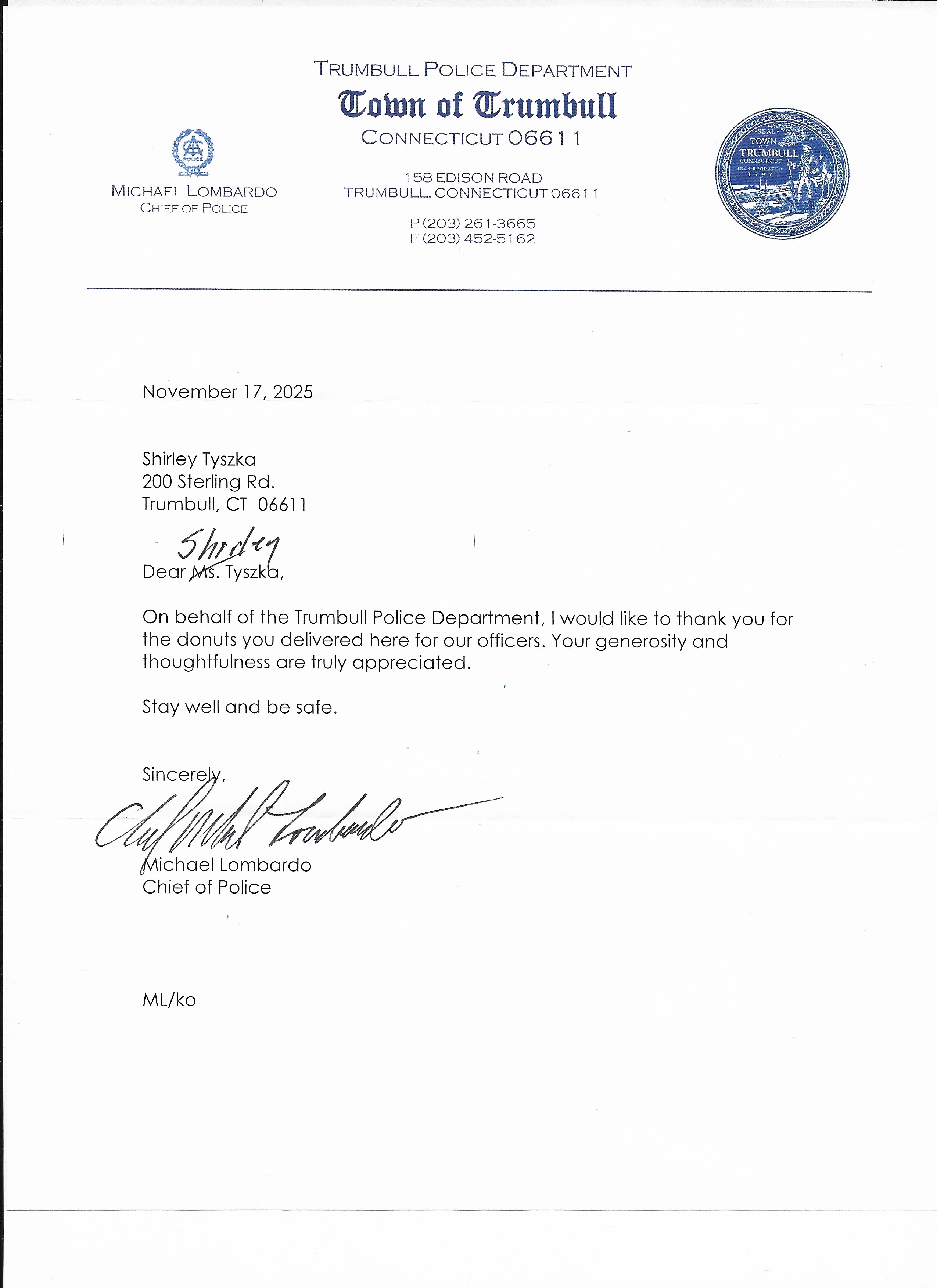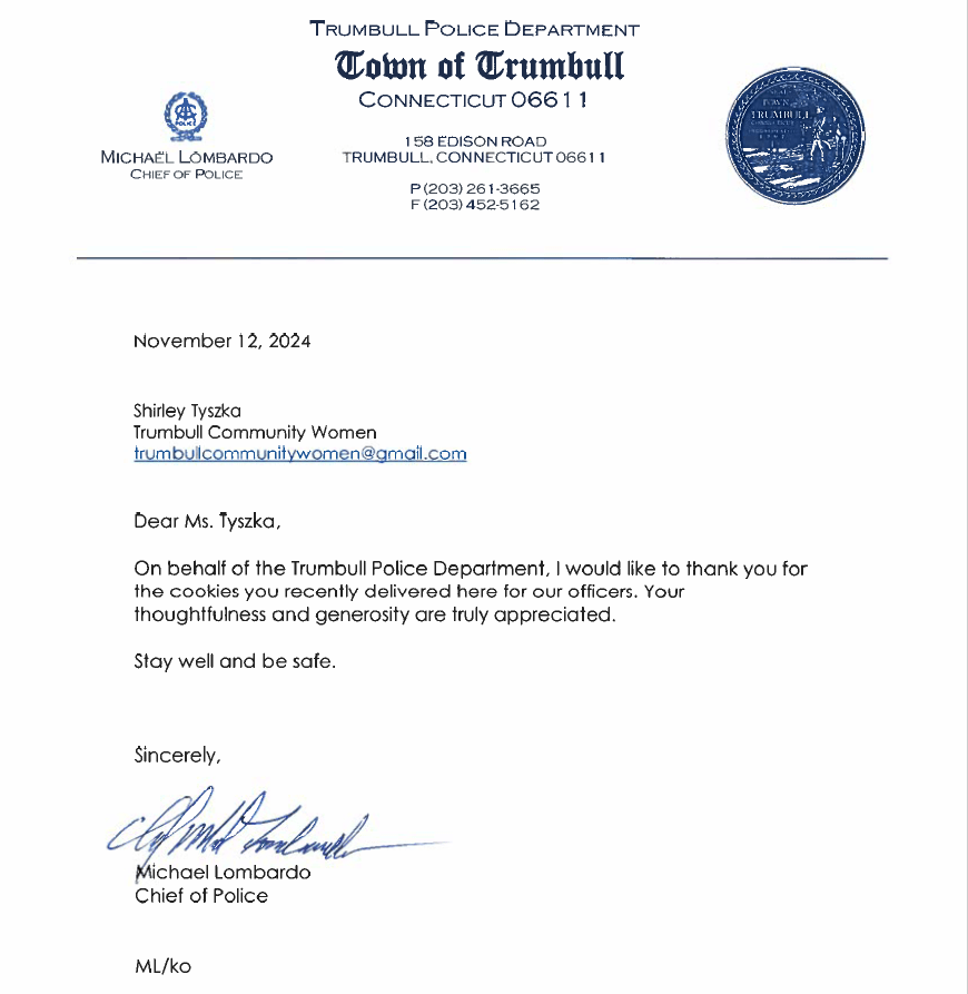 Thank you from Trumbull Police Department