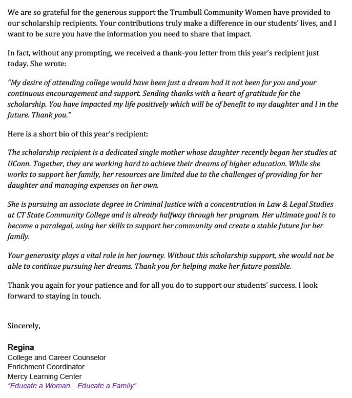 Thank you from Mercy Learning Center (for scholarship donation)!